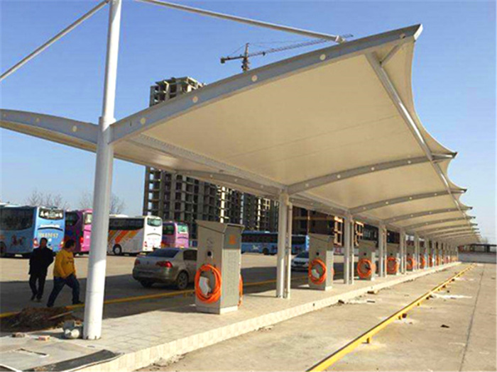 膜结构充电桩具有较好的透光性,其透光率为20%,在阳光暴晒下,使充电桩受到保护。膜结构充电桩表面经过氟素处理,自身不发粘具有很好的自洁性能。膜结构充电桩表面有防紫外线的共挤层,可防止太阳紫外线引起的树脂疲劳变黄现象,且使用寿命长达15-30年。