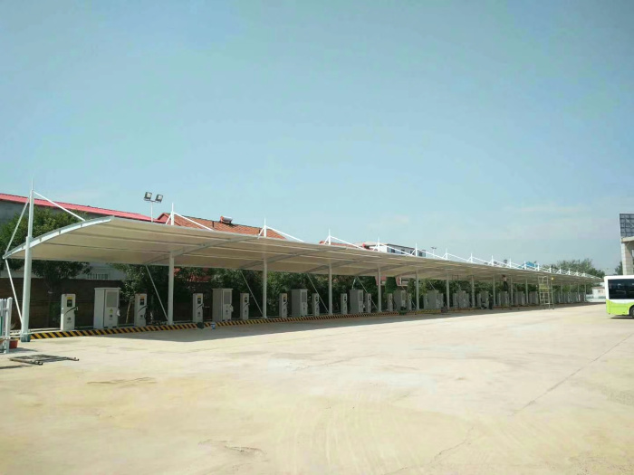 2、空间跨度大—空间跨度大,重量轻,膜结构充电桩绝对保证棚下人和物的安全;