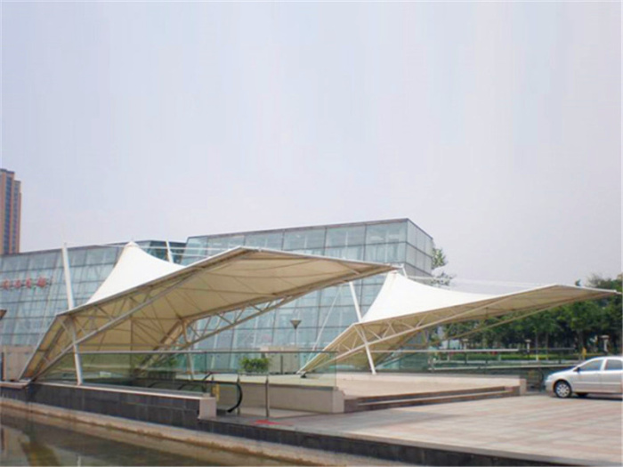 膜结构出入口又叫张拉膜结构,是21世纪最具代表性的建筑形式。打破了纯直线建筑风格的模式,以其独有的优美曲面造型,简洁、明快、刚与柔、力与美的完美组合,同时给建筑设计师提供了更大的想象和创造空间。