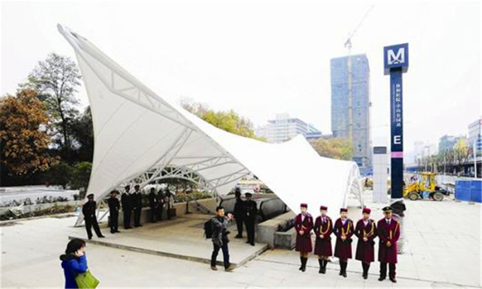 膜结构出入口又叫张拉膜结构,是21世纪最具代表性的建筑形式。打破了纯直线建筑风格的模式,以其独有的优美曲面造型,简洁、明快、刚与柔、力与美的完美组合,同时给建筑设计师提供了更大的想象和创造空间。