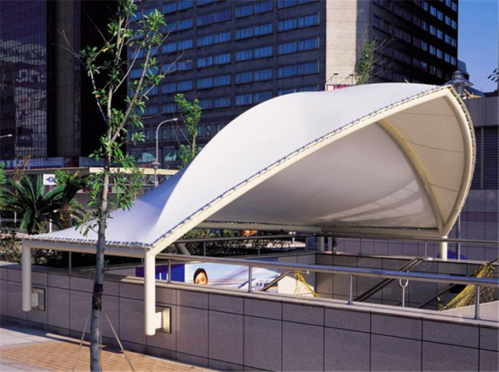 膜结构出入口又叫张拉膜结构,是21世纪最具代表性的建筑形式。打破了纯直线建筑风格的模式,以其独有的优美曲面造型,简洁、明快、刚与柔、力与美的完美组合,同时给建筑设计师提供了更大的想象和创造空间。