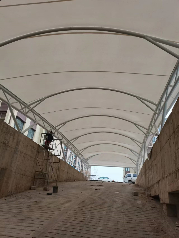 膜结构出入口又叫张拉膜结构,是21世纪最具代表性的建筑形式。打破了纯直线建筑风格的模式,以其独有的优美曲面造型,简洁、明快、刚与柔、力与美的完美组合,同时给建筑设计师提供了更大的想象和创造空间。